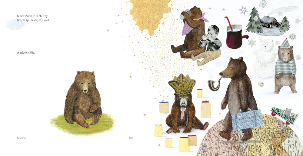 Zasněné verše o krabech srovnaných podle velikosti, škvíře pod poklopem na sladký moučník i o rohlíku, který sní, že ho nikdo nesní. Ilustrátorka Andrea Tachezy a básník Petr Borkovec na stránkách měkkého leporela v tvrdých deskách kombinují zdánlivě nekombinovatelné, nešetří absurditou a sladké kouzlo snění dopřávají nejen lidem, ale i věcem. Není už tu trochu přeslazeno? Ještěže si aspoň babička zahořkle stěžuje, že se jí zdají samé voloviny, jen o dědovi nikdy nic, jinak by se jednotlivé listy leporela samou sladkostí slepily k dohromady!